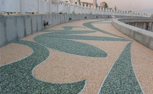 彩石环氧通体透水材料在彩石复合混凝土透水材料基础上舍去底层聚合物纤维多孔混凝土,同时加强面层的粘结性和厚度,并提高面层强度,其粘合材料需采用进口改性环氧树脂。